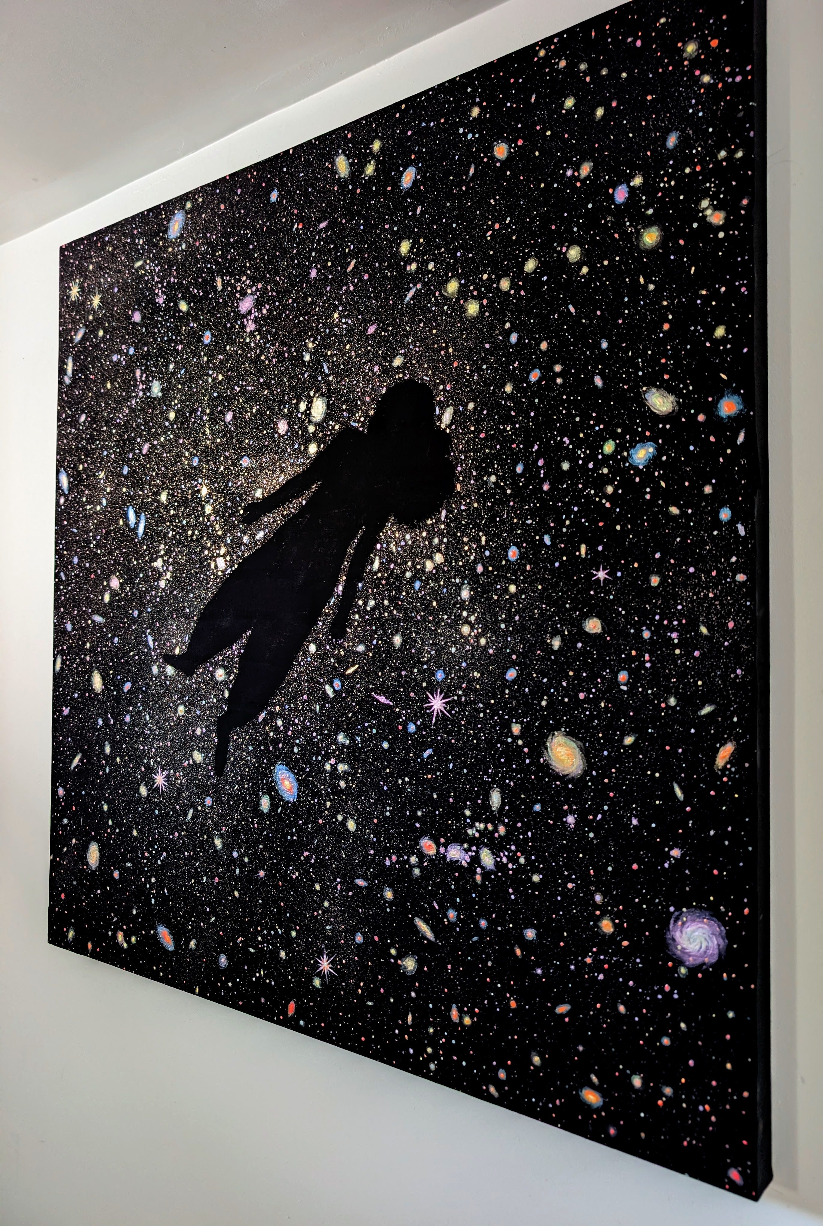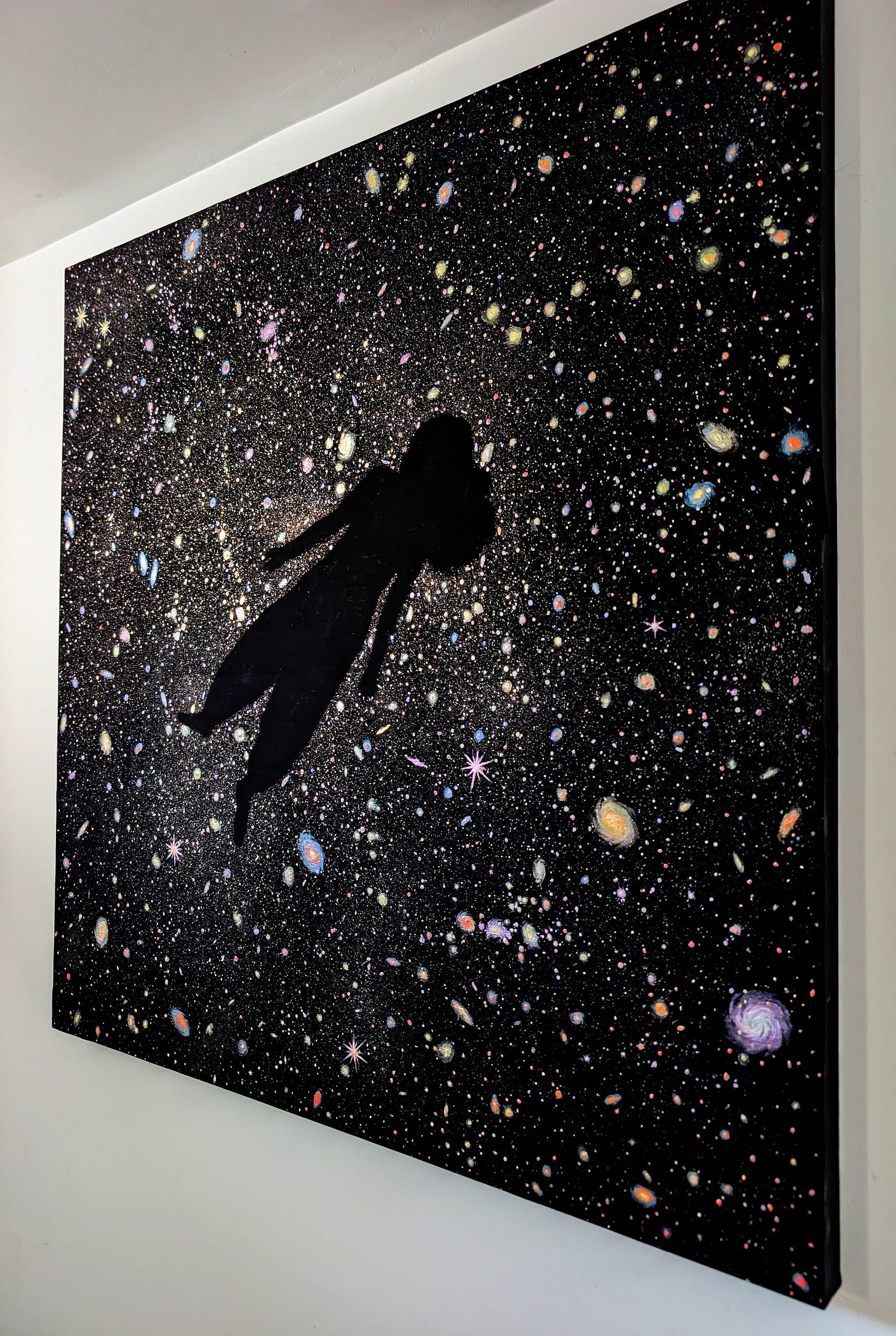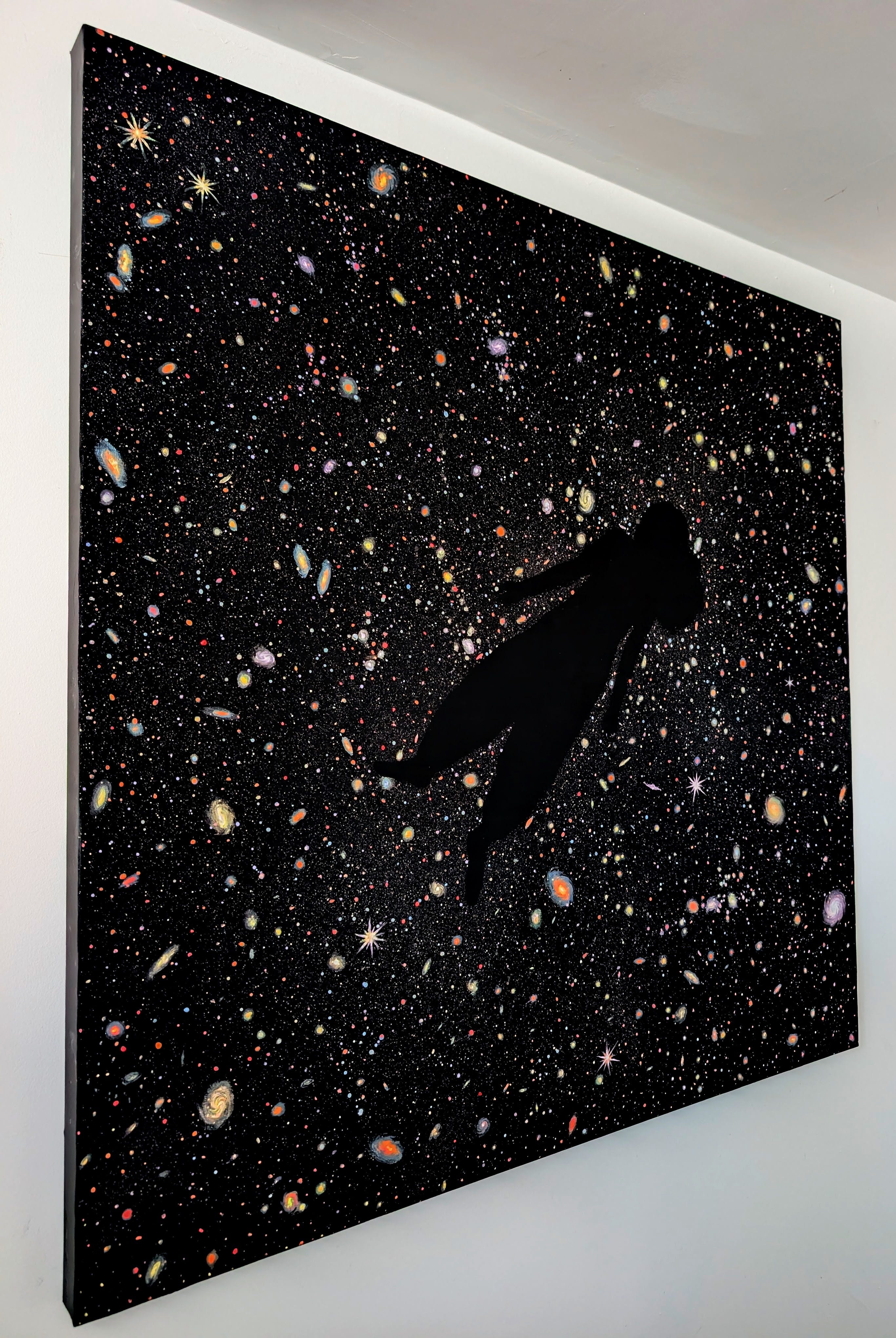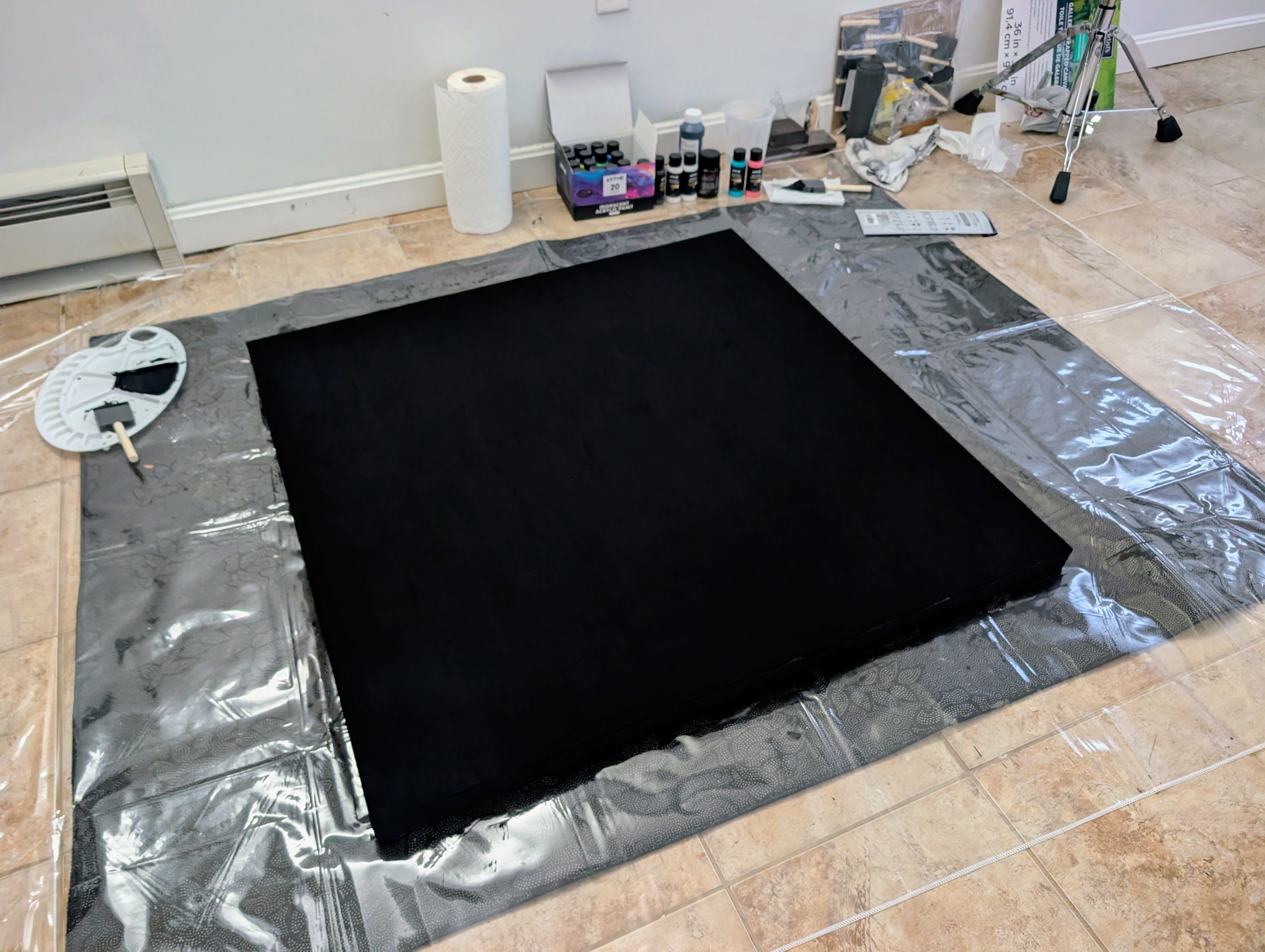 The materials were specific. Musou Black—an ultra-black pigment that absorbs up to 99.4% of visible light—on a large square gallery canvas—36” x 36”. Four layers of black gesso, sanded between coats to create a smooth surface. Two layers of Musou. Then iridescent acrylics for everything surrounding the figure.